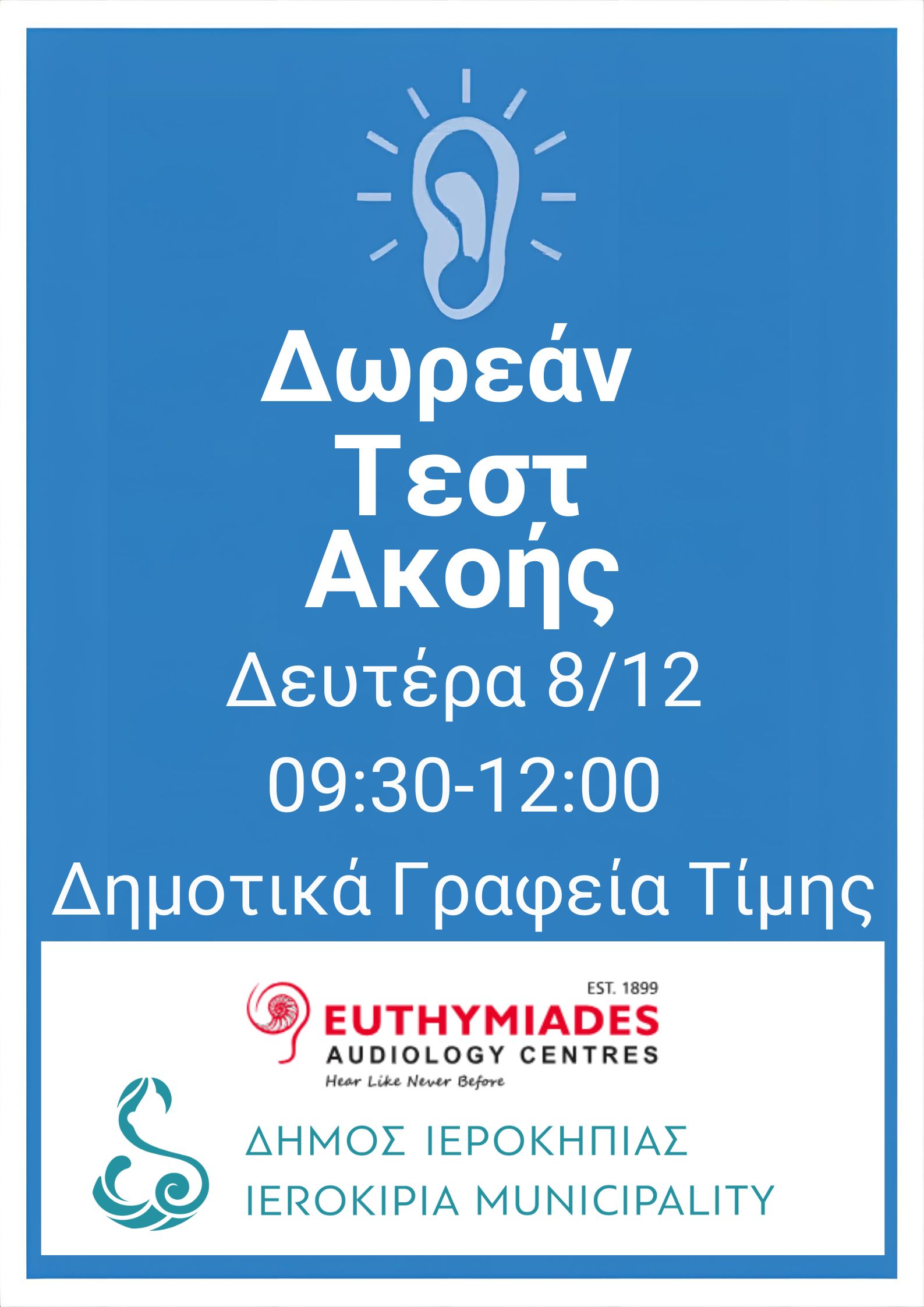 Ο Δήμος Ιεροκηπίας, σε συνεργασία με τα Ακουολογικά Κέντρα Ευθυμιάδη, προσκαλεί τους δημότες σε μια δράση αφιερωμένη στην πρόληψη και την προστασία της ακοής.