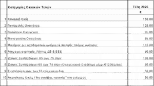 Για το έτος 2025, εφαρμόζονται τα ακόλουθα οικιακά τέλη:
