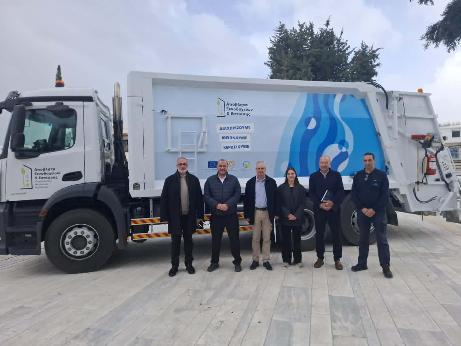 Μέσα στο πλαίσιο του προγράμματος Πολιτικής Συνοχής «ΘΑλΕΙΑ» 2021 – 2027 και του προγράμματος του Τμήματος Περιβάλλοντος «Μείωση στερεών δημοτικών αποβλήτων παραλιακών ξενοδοχειακών μονάδων και συναφών χώρων παραγωγής αποβλήτων στις επαρχίες Λεμεσού και Πάφου», ο Δήμος Ιεροκηπίας παρέλαβε σήμερα (28/1) ένα νέο απορριματοφόρο.