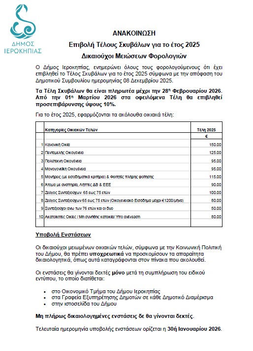 Ο Δήμος Ιεροκηπίας και η Εκκλησιαστική Επιτροπή του Ιερού Ναού της Αγίας Παρασκευής σας προσκαλούν στην Τελετή Κατάδυσης του Τιμίου Σταυρού και του Καθαγιασμού των Υδάτων, με την ευκαιρία του εορτασμού των Αγίων Θεοφανίων, την Τρίτη 6 Ιανουαρίου 2026 και ώρα 10.30π.μ., στη Δημοτική Παραλία Γεροσκήπου (Ράμπα Σκαφών).