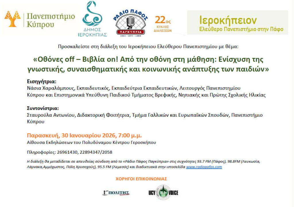 Στο πλαίσιο του προγράμματος δημοσίων διαλέξεων «Ιεροκήπειον Ελεύθερο Πανεπιστήμιο στην Πάφο», που διοργανώνουν από κοινού ο Δήμος Ιεροκηπίας, το Πανεπιστήμιο Κύπρου και το Ράδιο Πάφος, θα πραγματοποιηθεί την Παρασκευή, 30 Ιανουαρίου 2026 και ώρα 7.00μ.μ., στην Αίθουσα Εκδηλώσεων του Πολυδύναμου Κέντρου Γεροσκήπου, η τρίτη διάλεξη του 22ου κύκλου.