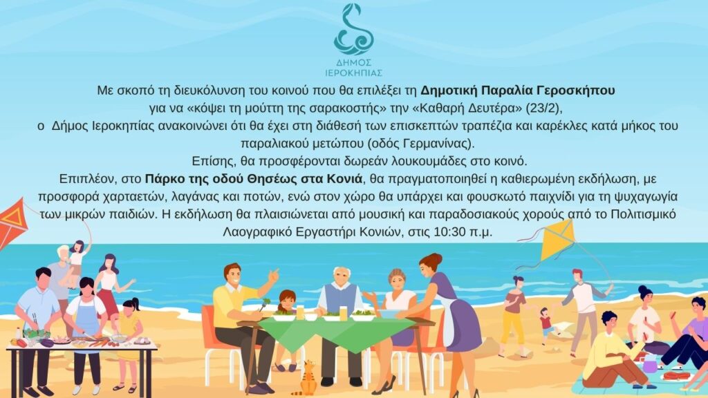 Με σκοπό τη διευκόλυνση του κοινού που θα επιλέξει τη Δημοτική Παραλία Γεροσκήπου για να «κόψει τη μούττη της σαρακοστής» την «Καθαρή Δευτέρα» (23/2), ο  Δήμος Ιεροκηπίας ανακοινώνει ότι θα έχει στη διάθεσή των επισκεπτών τραπέζια και καρέκλες κατά μήκος του παραλιακού μετώπου (οδός Γερμανίνας). Επίσης, θα προσφέρονται δωρεάν λουκουμάδες στο κοινό.
