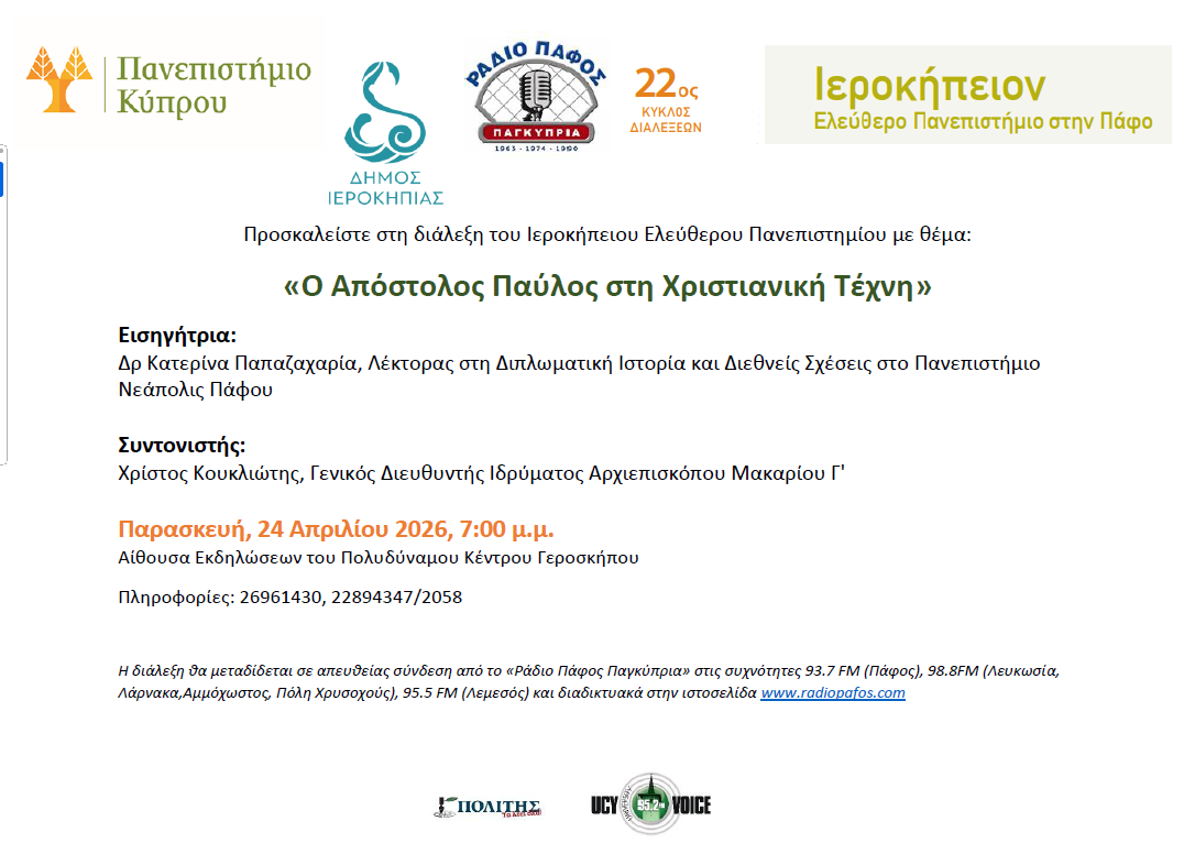 Στο πλαίσιο του προγράμματος δημοσίων διαλέξεων «Ιεροκήπειον Ελεύθερο Πανεπιστήμιο στην Πάφο», που διοργανώνουν από κοινού ο Δήμος Ιεροκηπίας, το Πανεπιστήμιο Κύπρου και το Ράδιο Πάφος, θα πραγματοποιηθεί την Παρασκευή, 24 Απριλίου 2026 και ώρα 7.00μ.μ., στην Αίθουσα Εκδηλώσεων του Πολυδύναμου Κέντρου Γεροσκήπου, η πέμπτη διάλεξη του 22ου κύκλου.